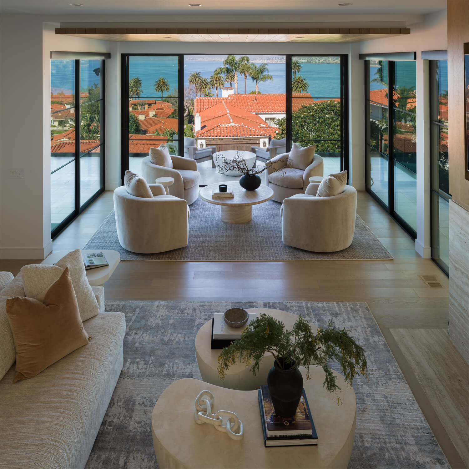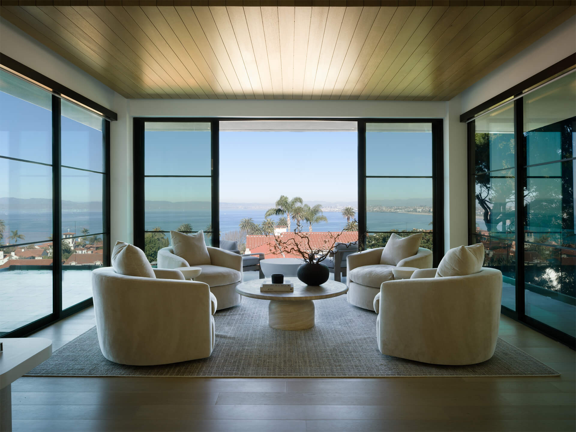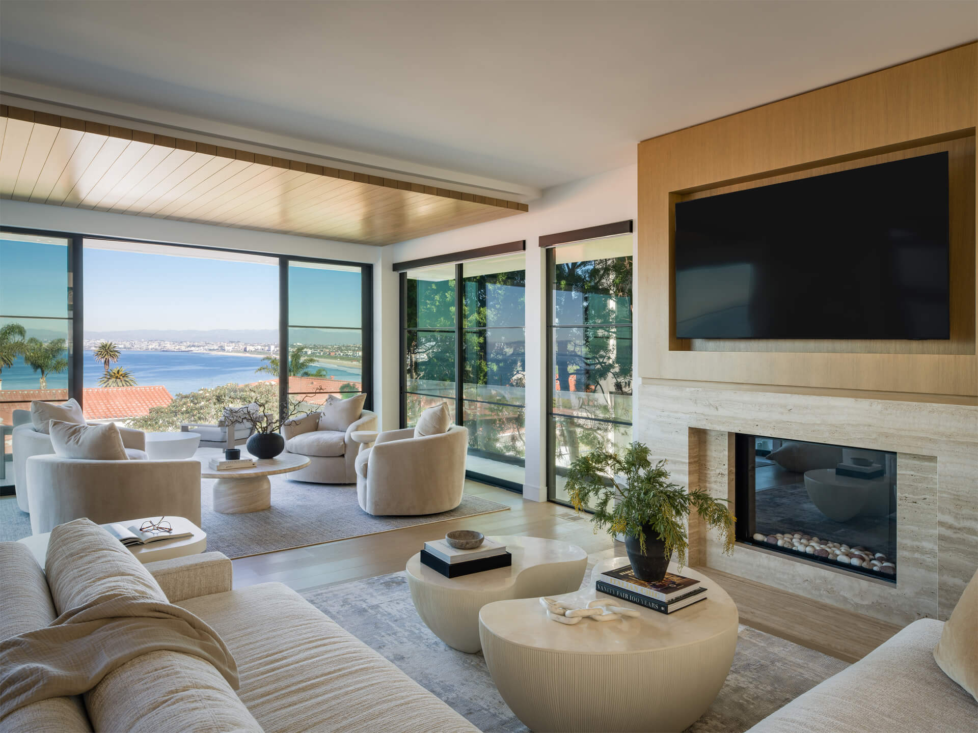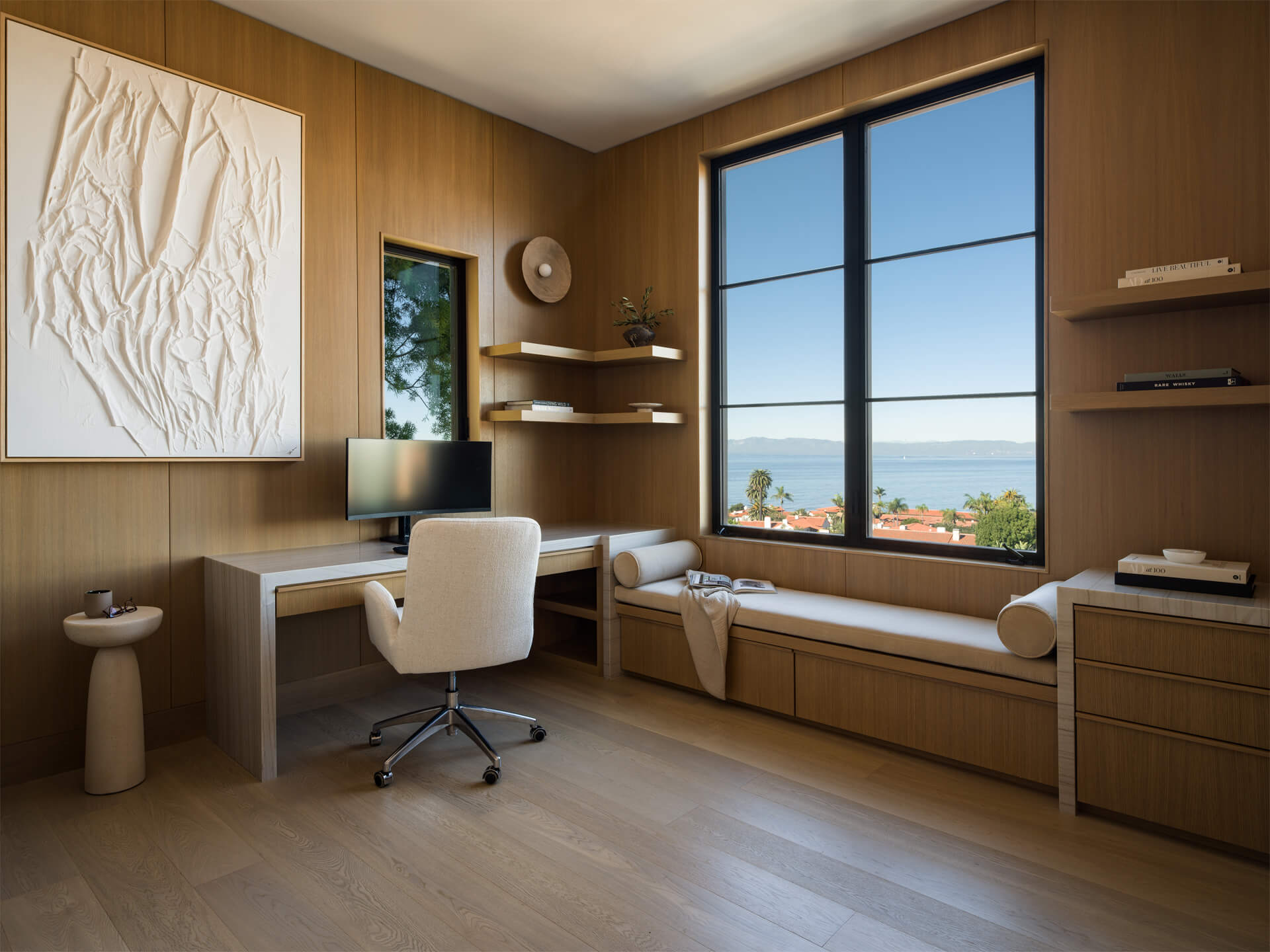 This residence is a study in quiet luxury, balancing refined materials with effortless coastal living. Floor to ceiling glass frames expansive ocean views, while warm wood paneling and soft neutral furnishings create a calm, cohesive interior palette. The living spaces are layered with natural textures, sculptural forms, and custom millwork, from the integrated fireplace wall to the tailored built in office. In the bath, honed marble surfaces and streamlined fixtures deliver a sense of understated elegance. The homeowner, who lives overseas, returns often to enjoy this retreat with family and friends, gathering for relaxed evenings, shared meals, and drinks against the backdrop of the sea.