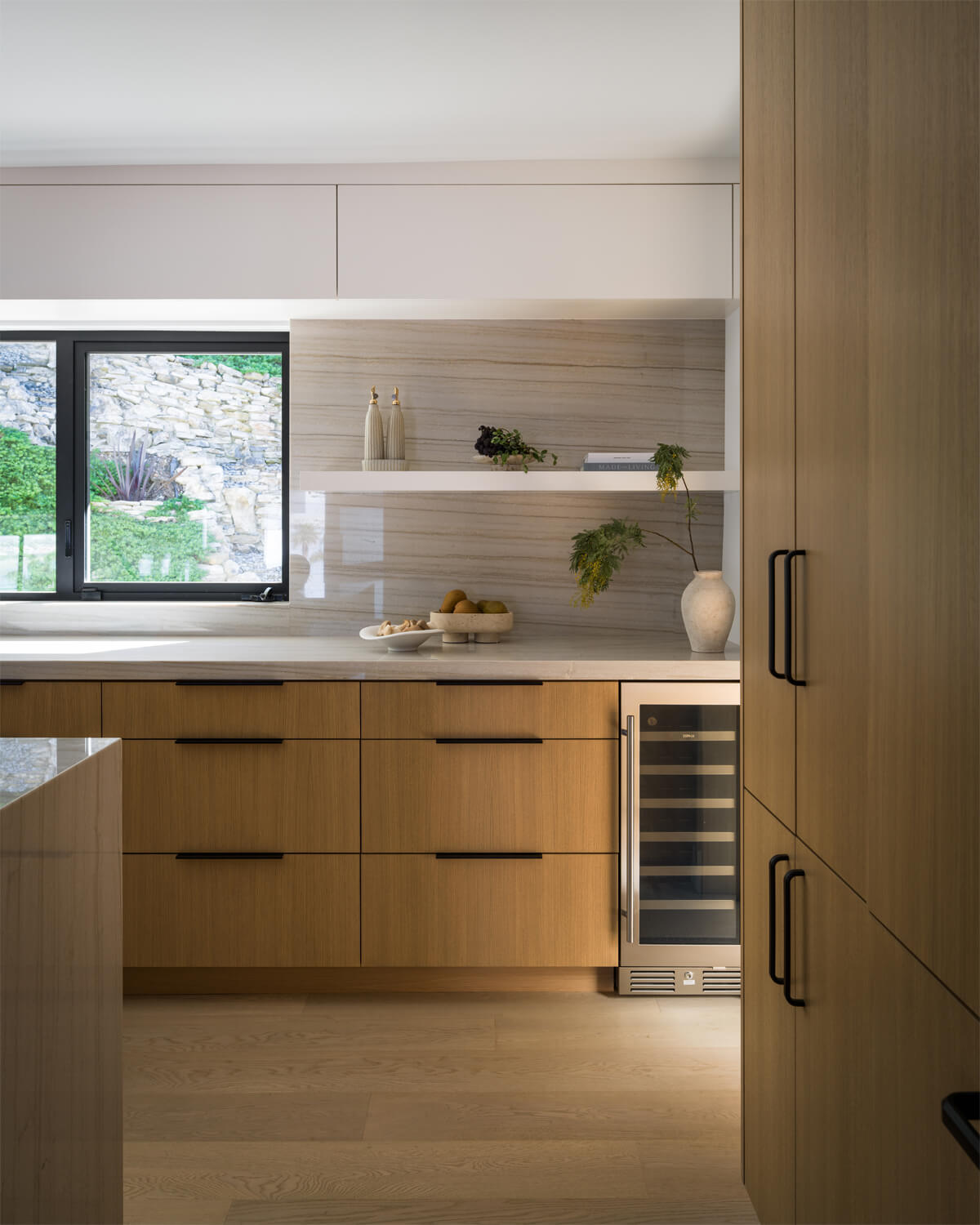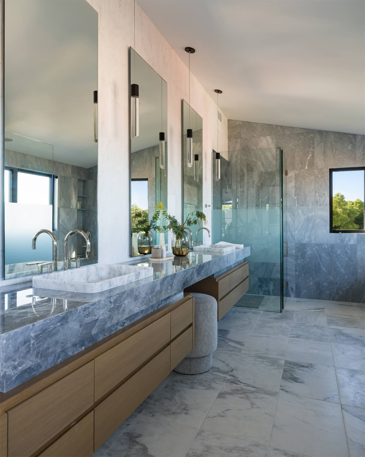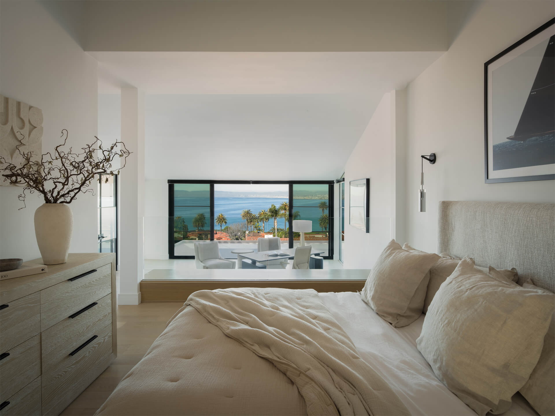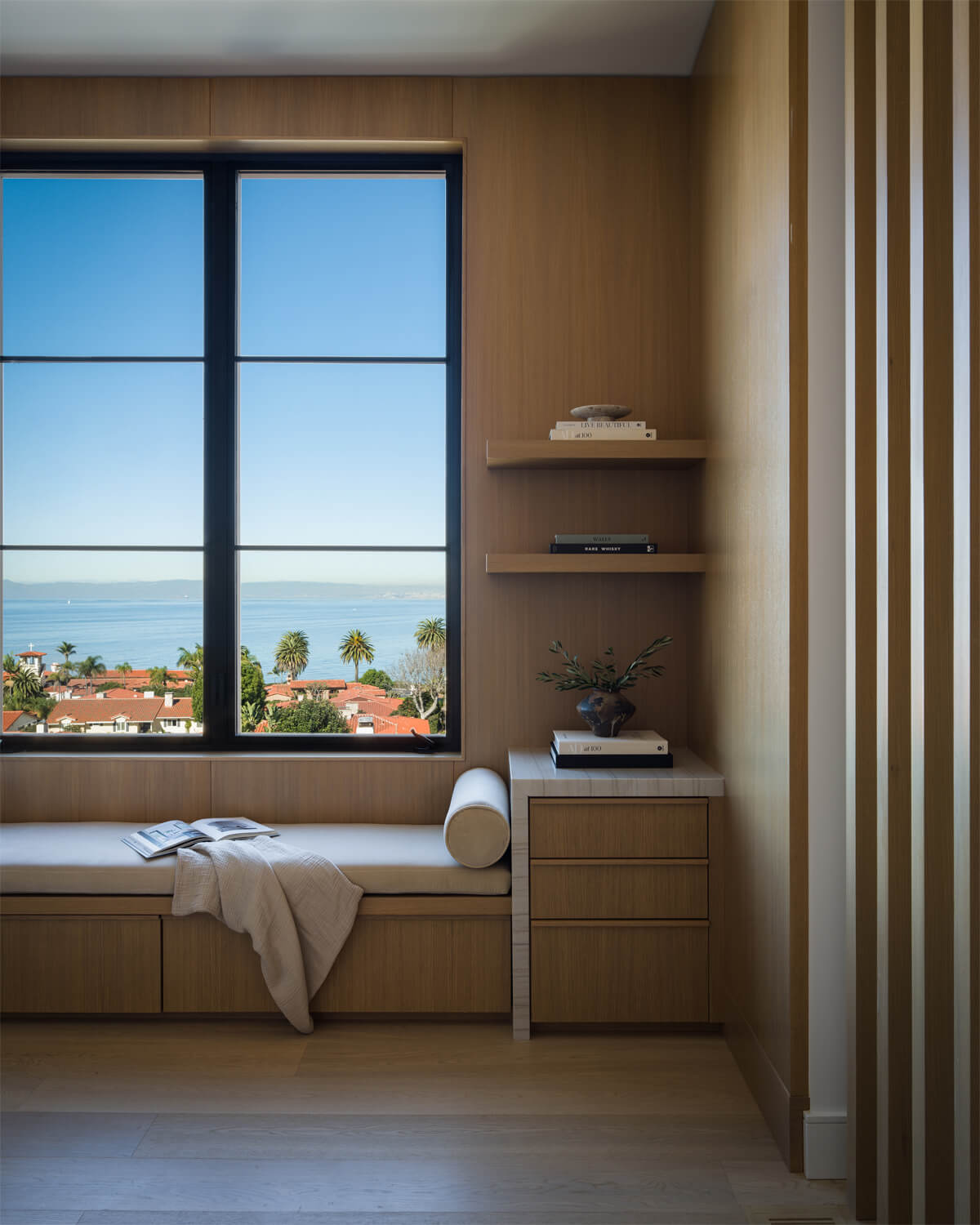 This residence is a study in quiet luxury, balancing refined materials with effortless coastal living. Floor to ceiling glass frames expansive ocean views, while warm wood paneling and soft neutral furnishings create a calm, cohesive interior palette. The living spaces are layered with natural textures, sculptural forms, and custom millwork, from the integrated fireplace wall to the tailored built in office. In the bath, honed marble surfaces and streamlined fixtures deliver a sense of understated elegance. The homeowner, who lives overseas, returns often to enjoy this retreat with family and friends, gathering for relaxed evenings, shared meals, and drinks against the backdrop of the sea.