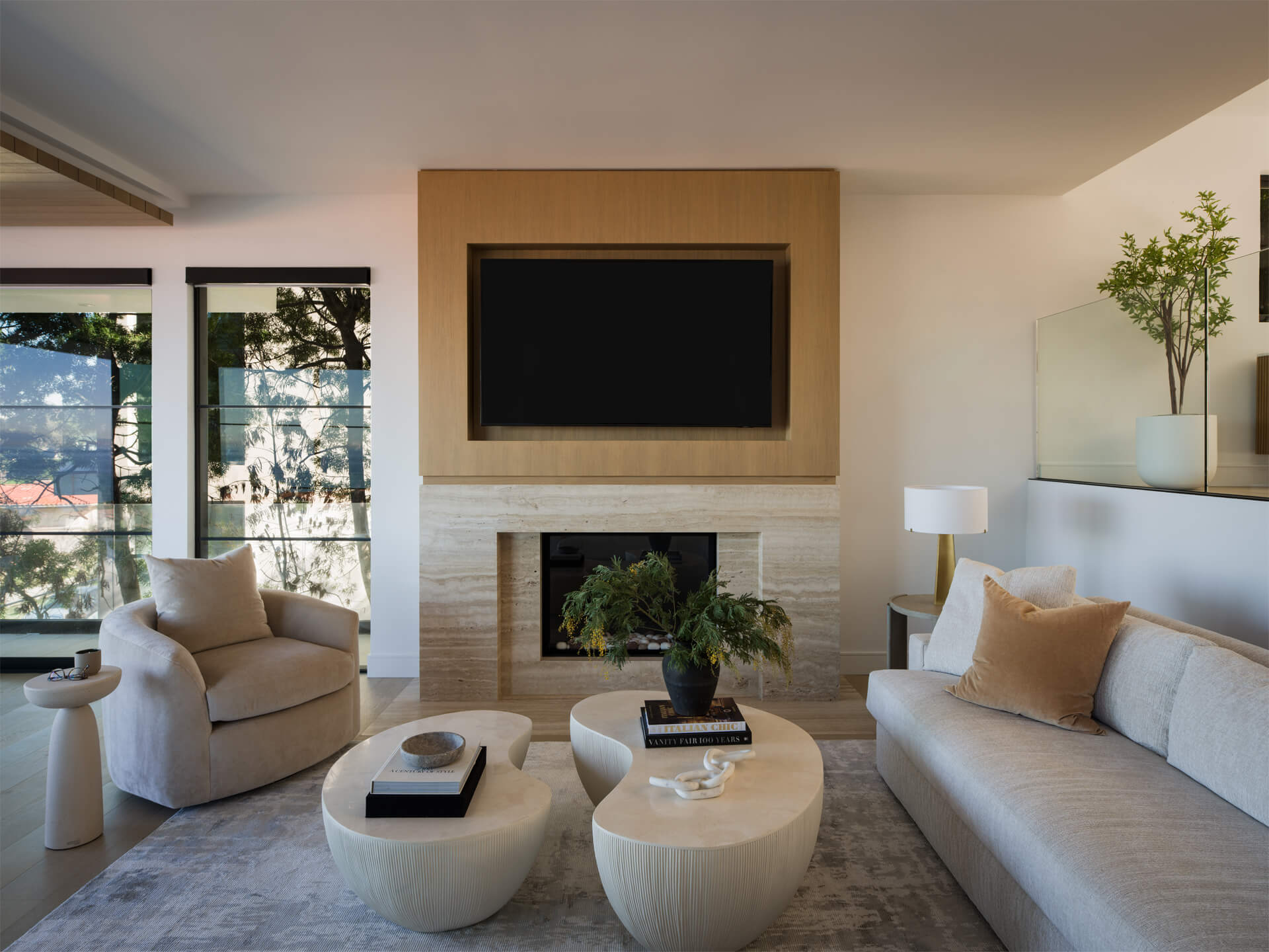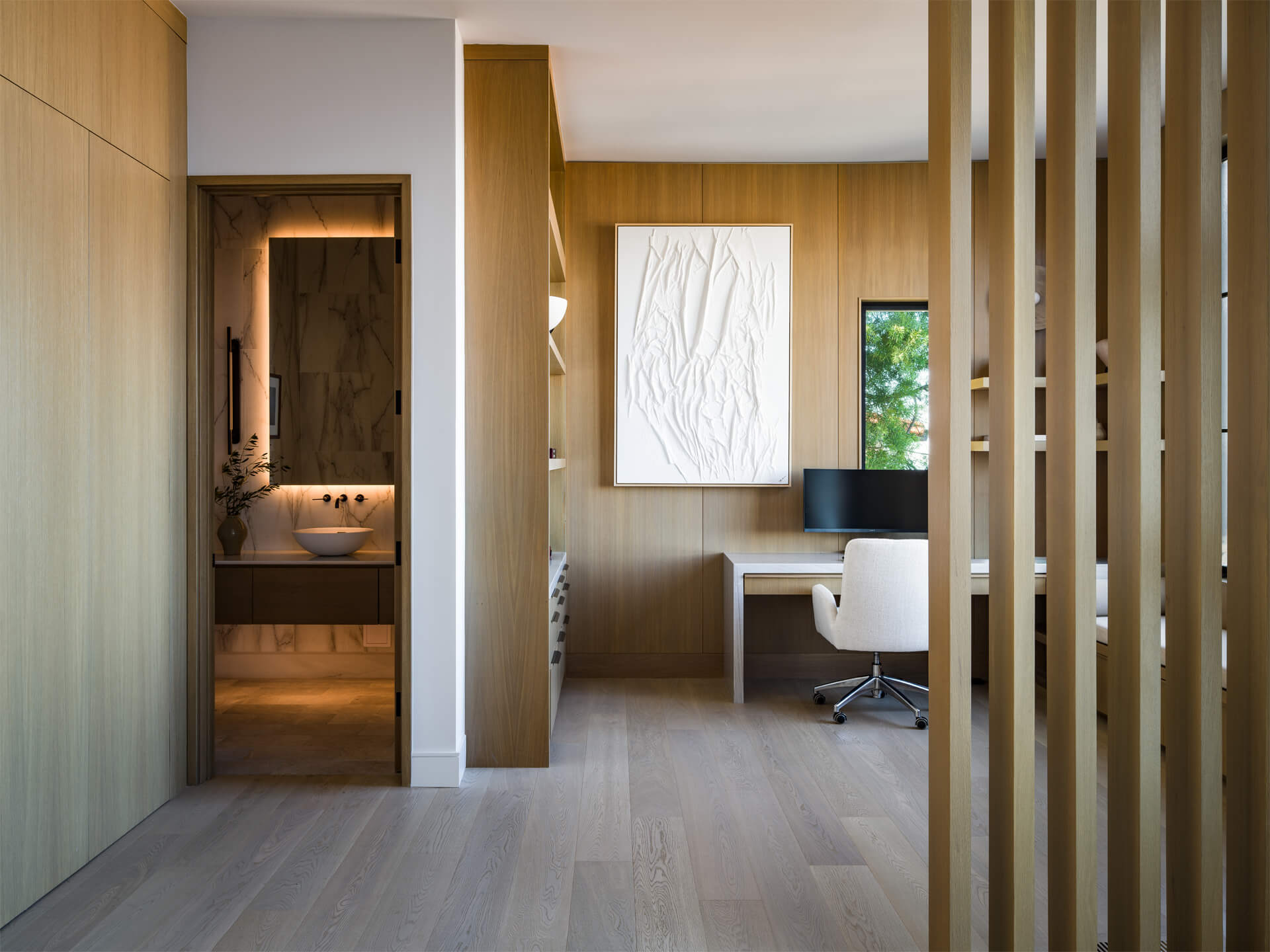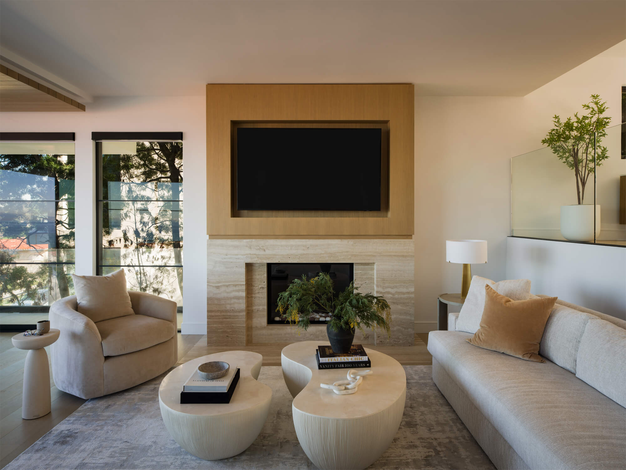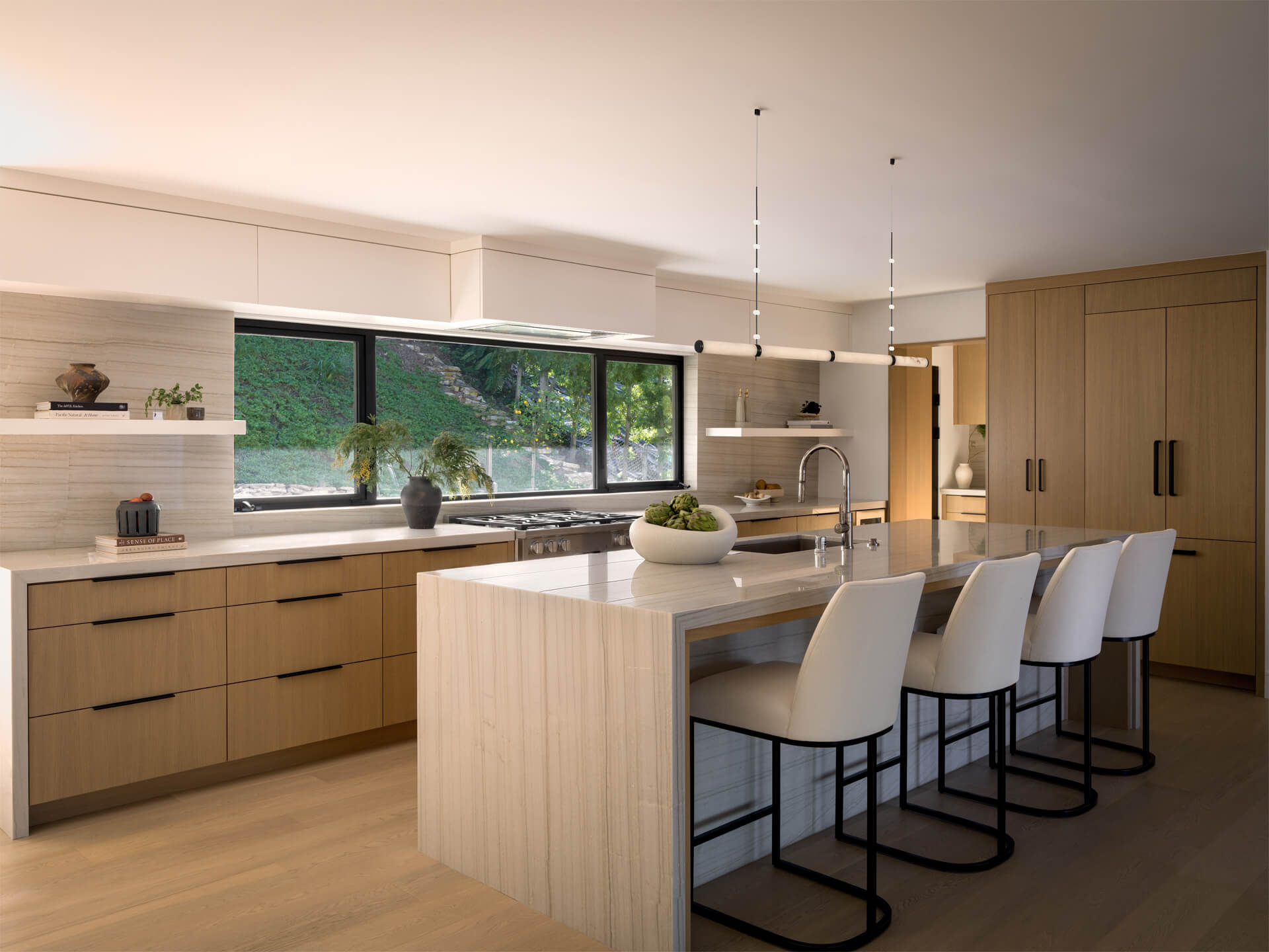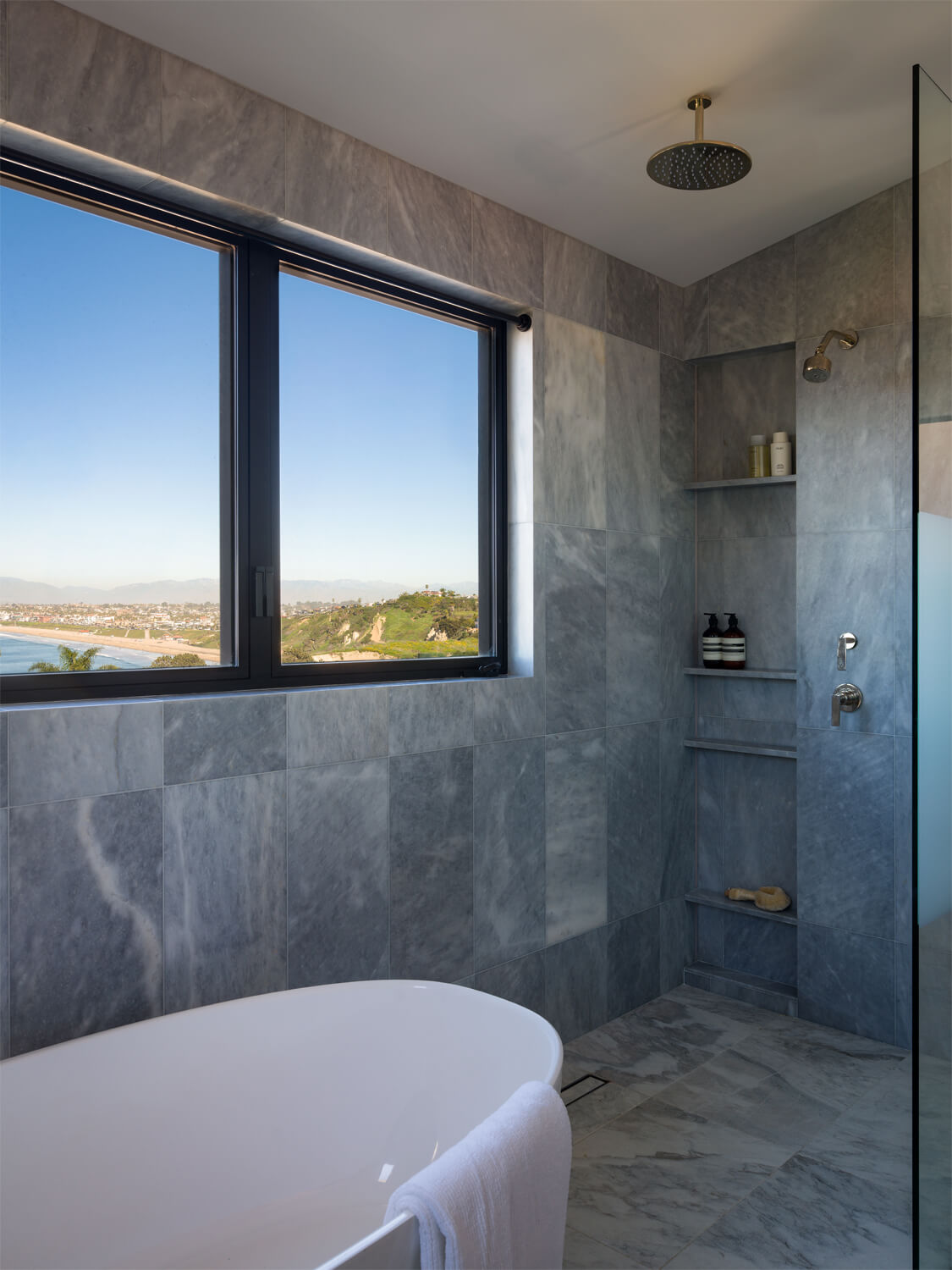 This residence is a study in quiet luxury, balancing refined materials with effortless coastal living. Floor to ceiling glass frames expansive ocean views, while warm wood paneling and soft neutral furnishings create a calm, cohesive interior palette. The living spaces are layered with natural textures, sculptural forms, and custom millwork, from the integrated fireplace wall to the tailored built in office. In the bath, honed marble surfaces and streamlined fixtures deliver a sense of understated elegance. The homeowner, who lives overseas, returns often to enjoy this retreat with family and friends, gathering for relaxed evenings, shared meals, and drinks against the backdrop of the sea.