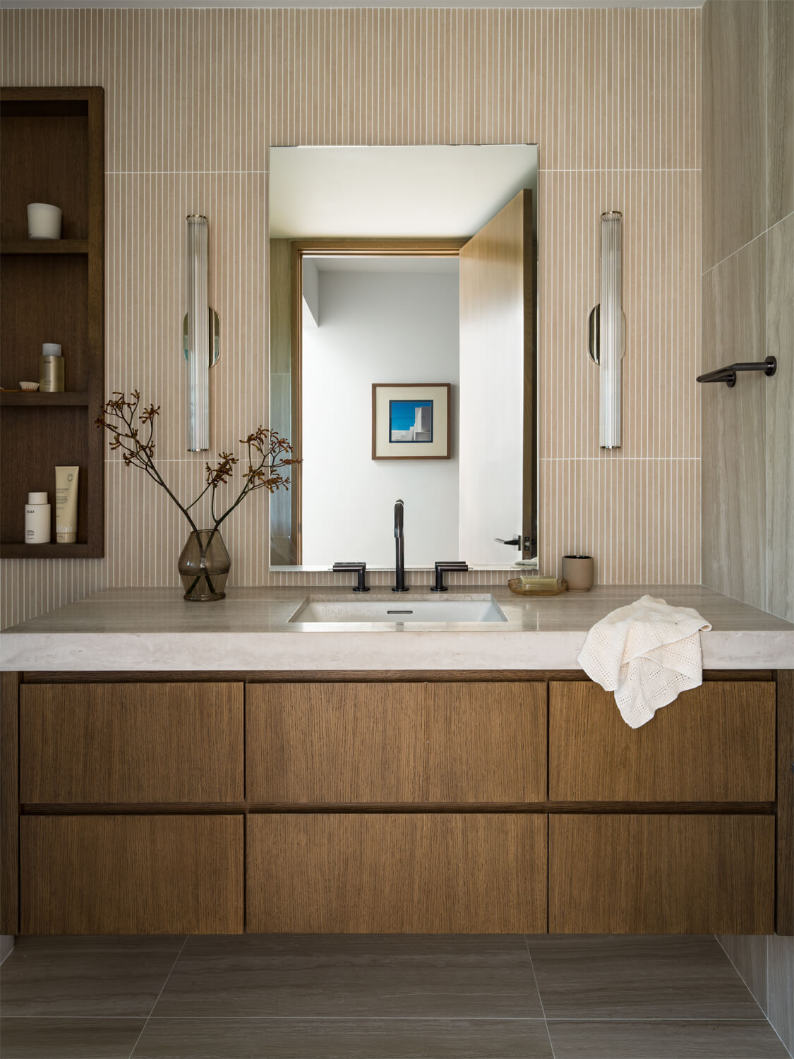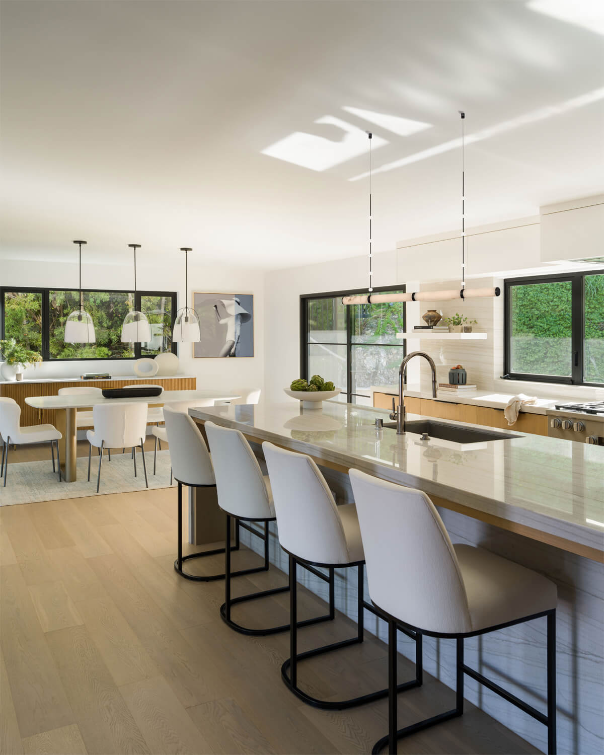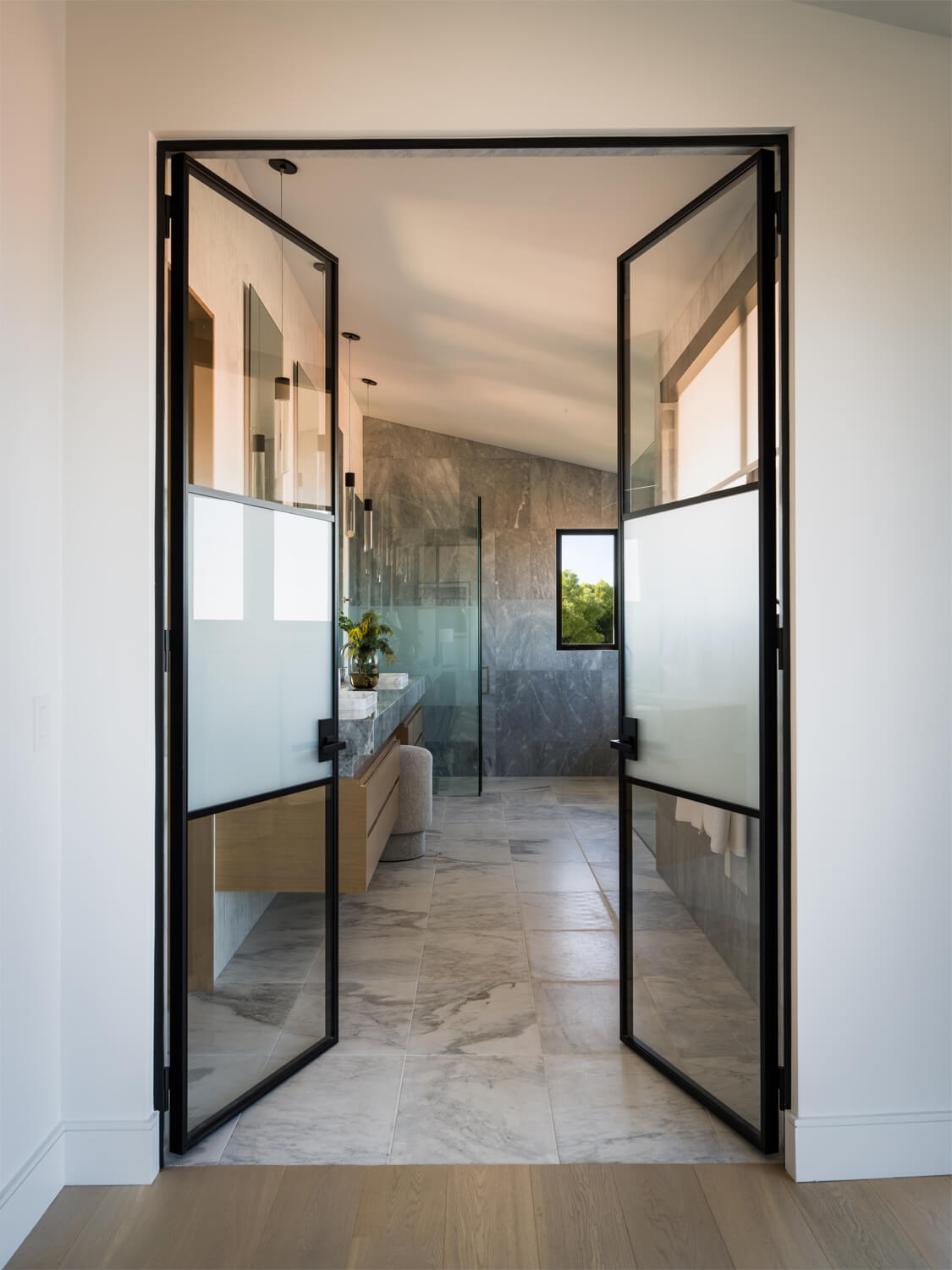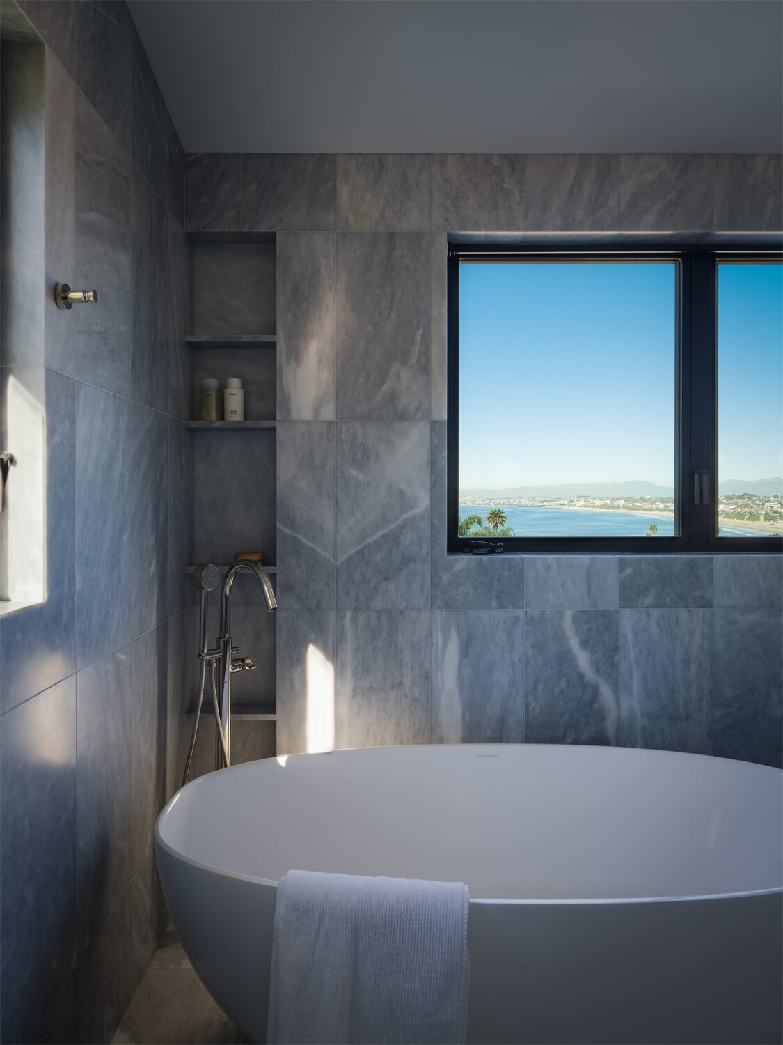 This residence is a study in quiet luxury, balancing refined materials with effortless coastal living. Floor to ceiling glass frames expansive ocean views, while warm wood paneling and soft neutral furnishings create a calm, cohesive interior palette. The living spaces are layered with natural textures, sculptural forms, and custom millwork, from the integrated fireplace wall to the tailored built in office. In the bath, honed marble surfaces and streamlined fixtures deliver a sense of understated elegance. The homeowner, who lives overseas, returns often to enjoy this retreat with family and friends, gathering for relaxed evenings, shared meals, and drinks against the backdrop of the sea.