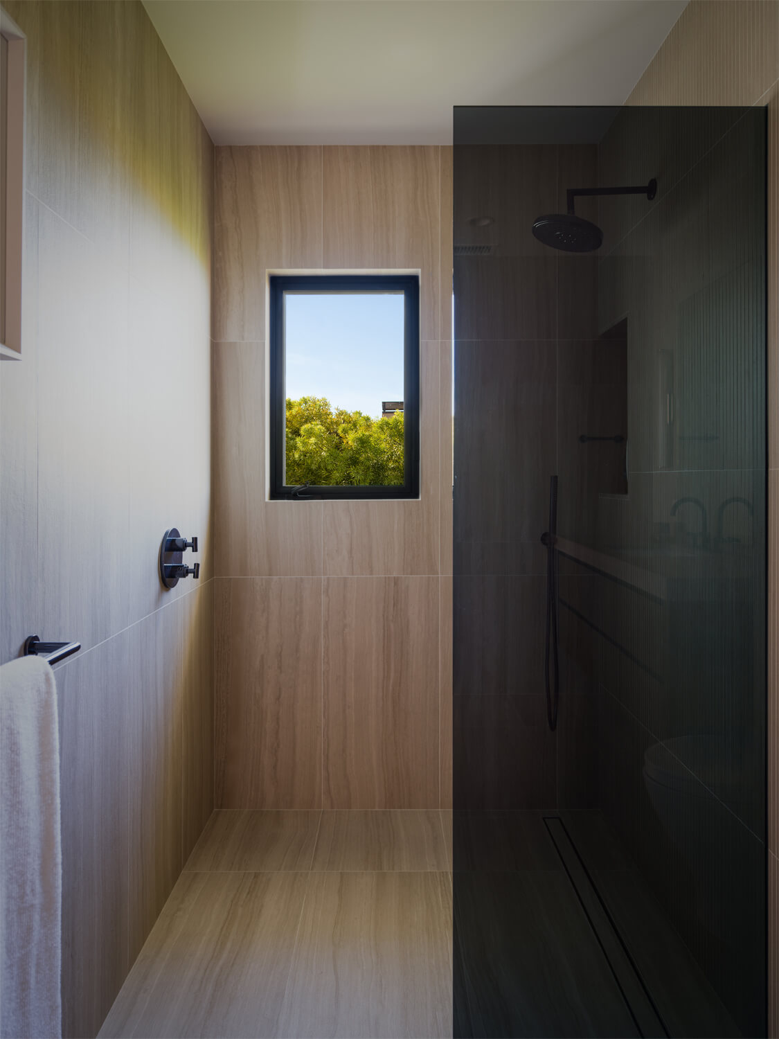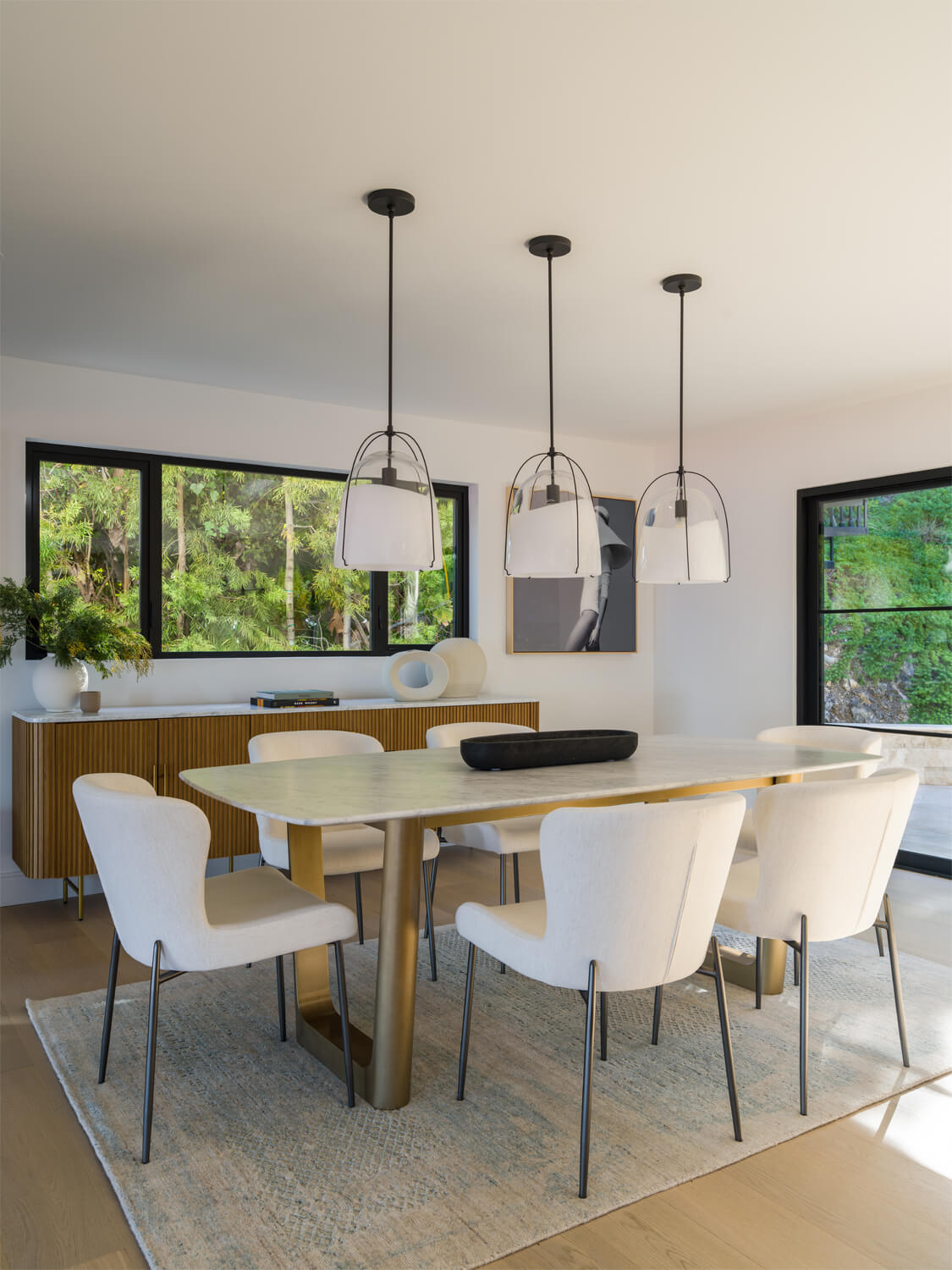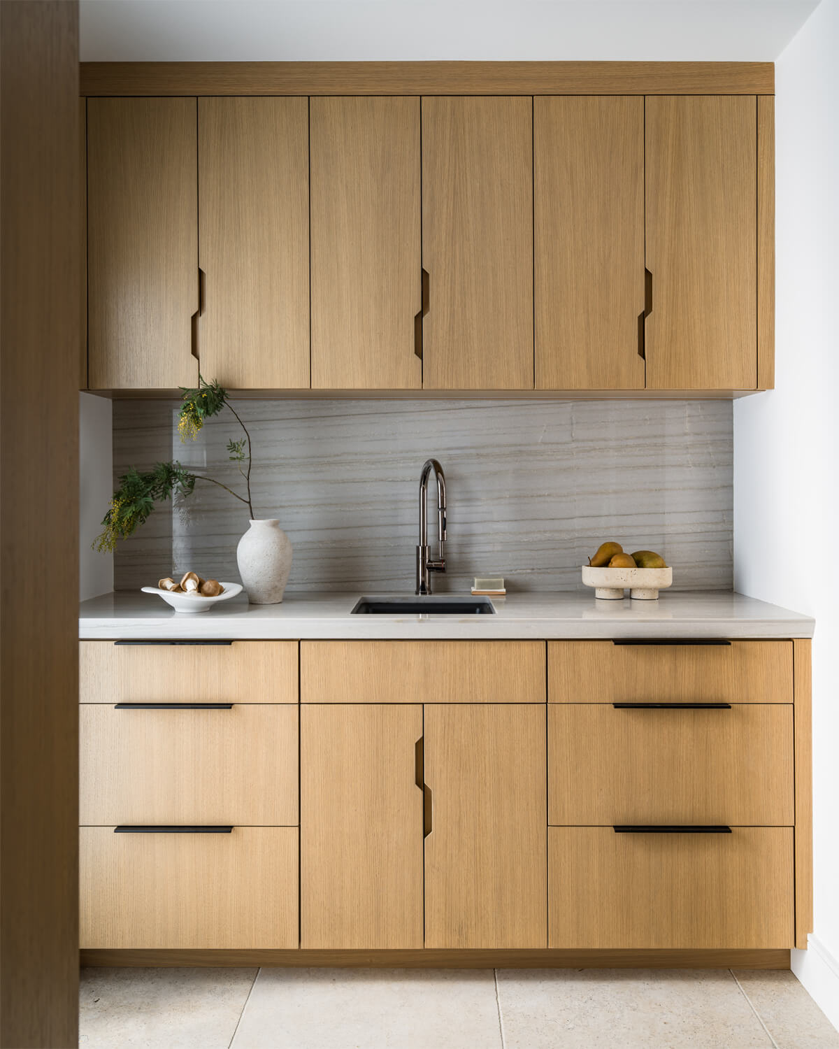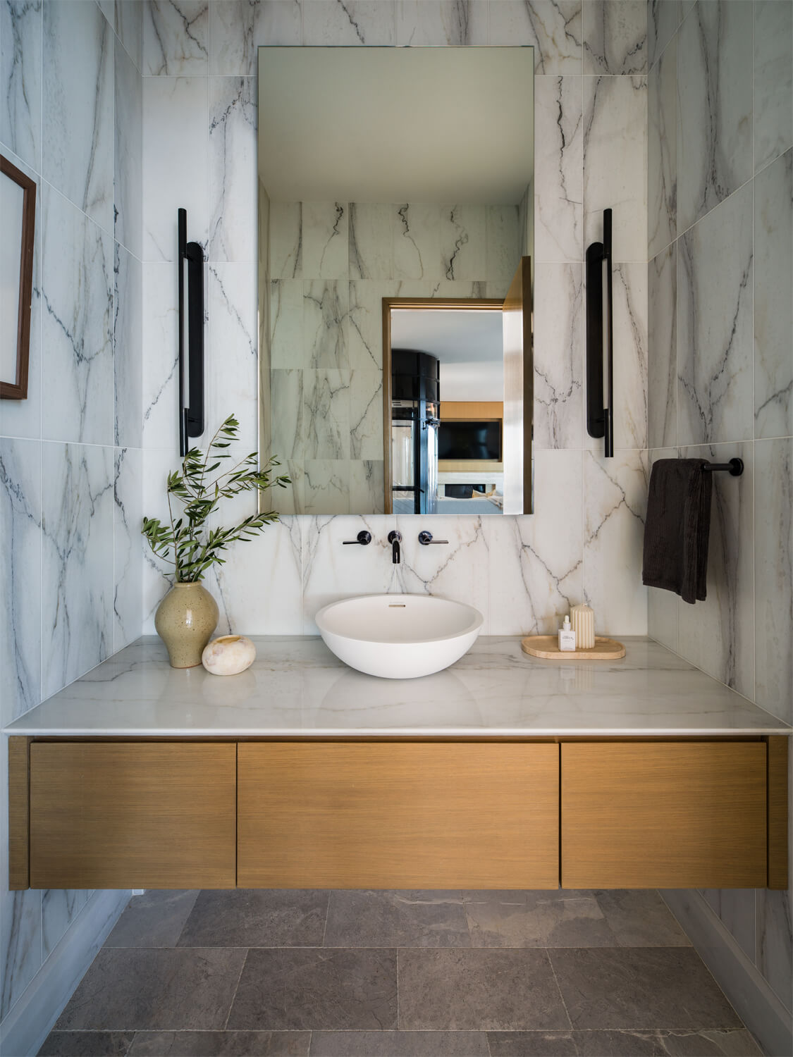 This residence is a study in quiet luxury, balancing refined materials with effortless coastal living. Floor to ceiling glass frames expansive ocean views, while warm wood paneling and soft neutral furnishings create a calm, cohesive interior palette. The living spaces are layered with natural textures, sculptural forms, and custom millwork, from the integrated fireplace wall to the tailored built in office. In the bath, honed marble surfaces and streamlined fixtures deliver a sense of understated elegance. The homeowner, who lives overseas, returns often to enjoy this retreat with family and friends, gathering for relaxed evenings, shared meals, and drinks against the backdrop of the sea.